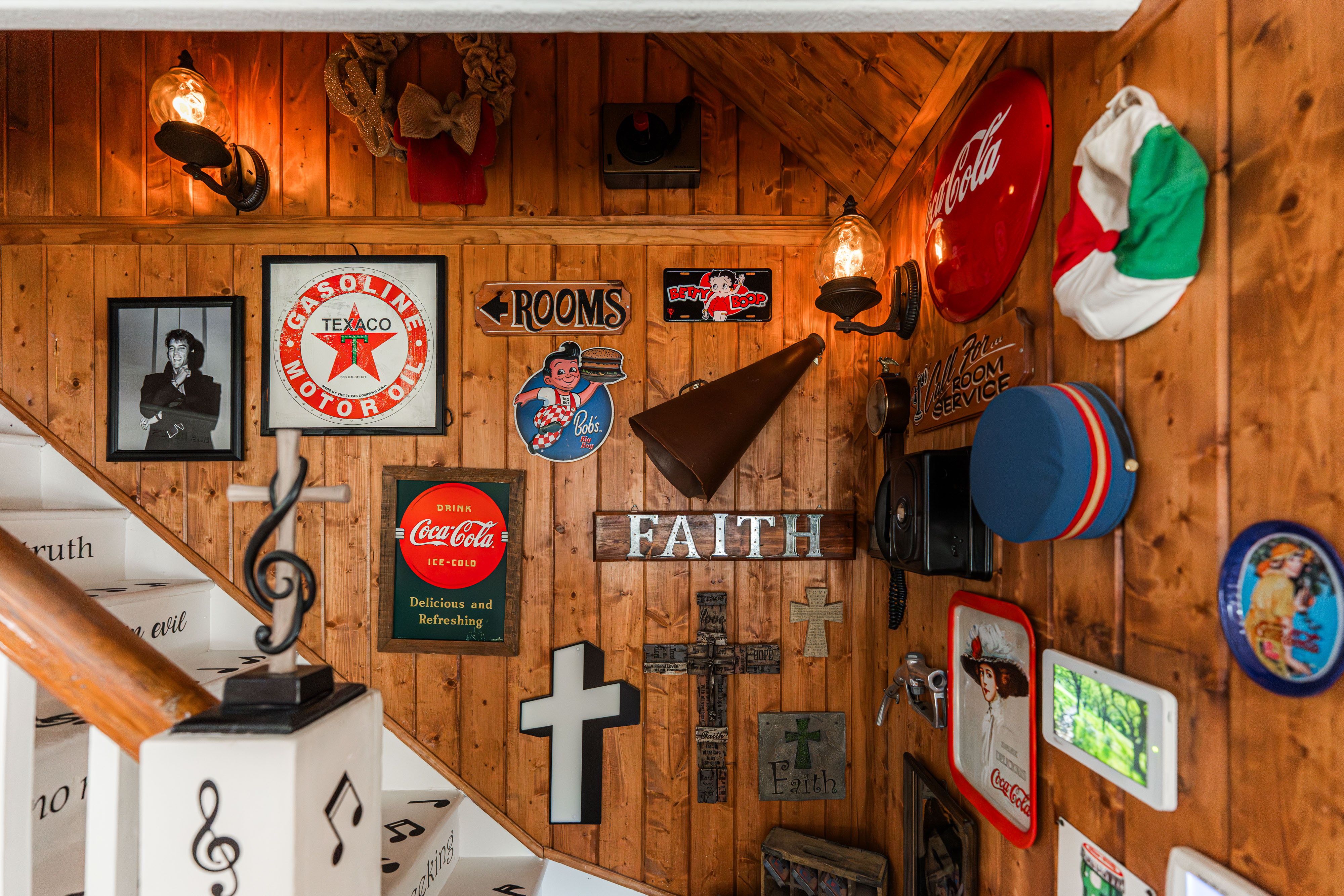Knotty wood paneling, another look right out of the 1950s, may seem original to the house but is another detail the Galtos brought in to complete the nostalgic feeling of the house. They've also painted a Bible verse ("Love is patient, love is kind") and musical notes on the stairs.