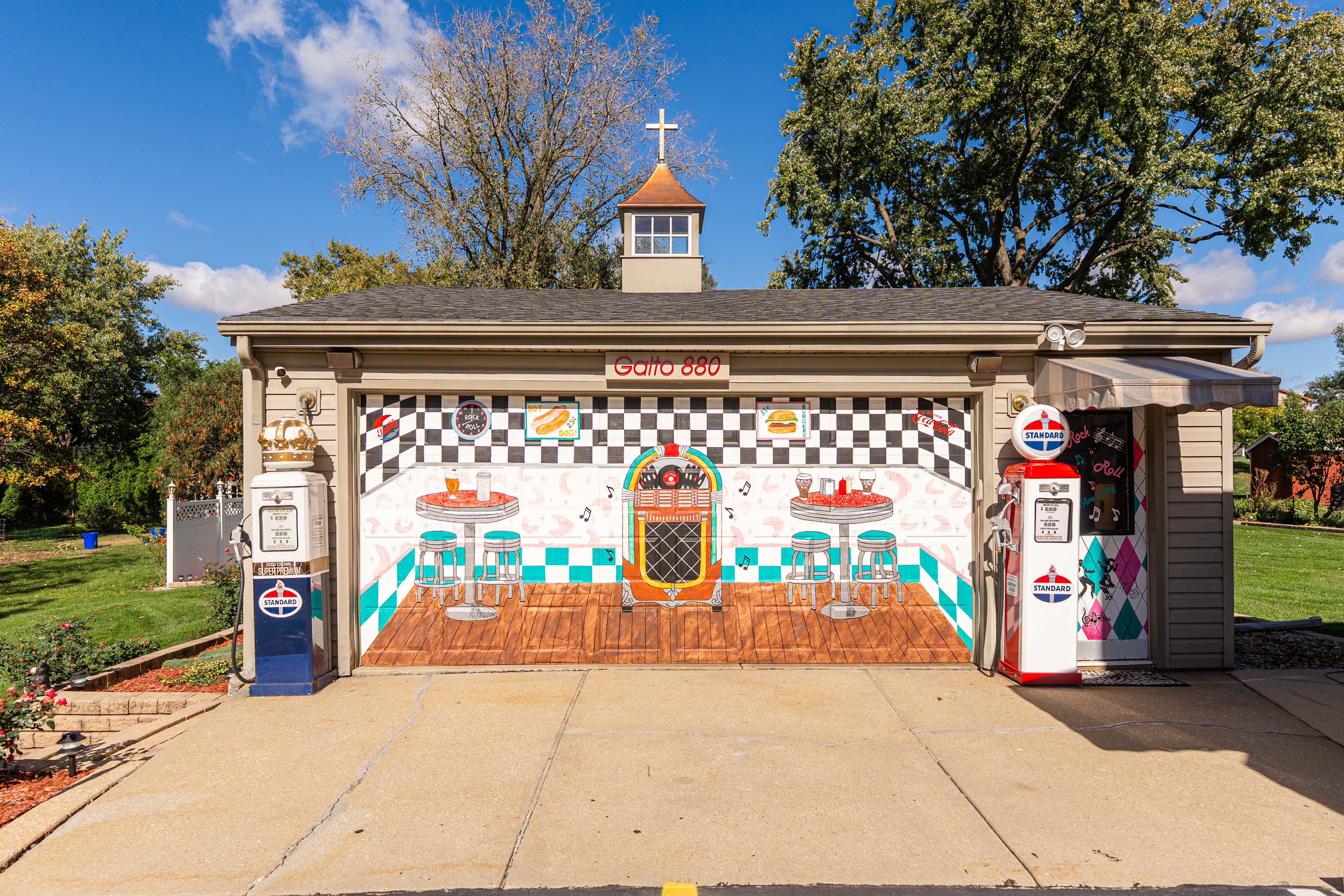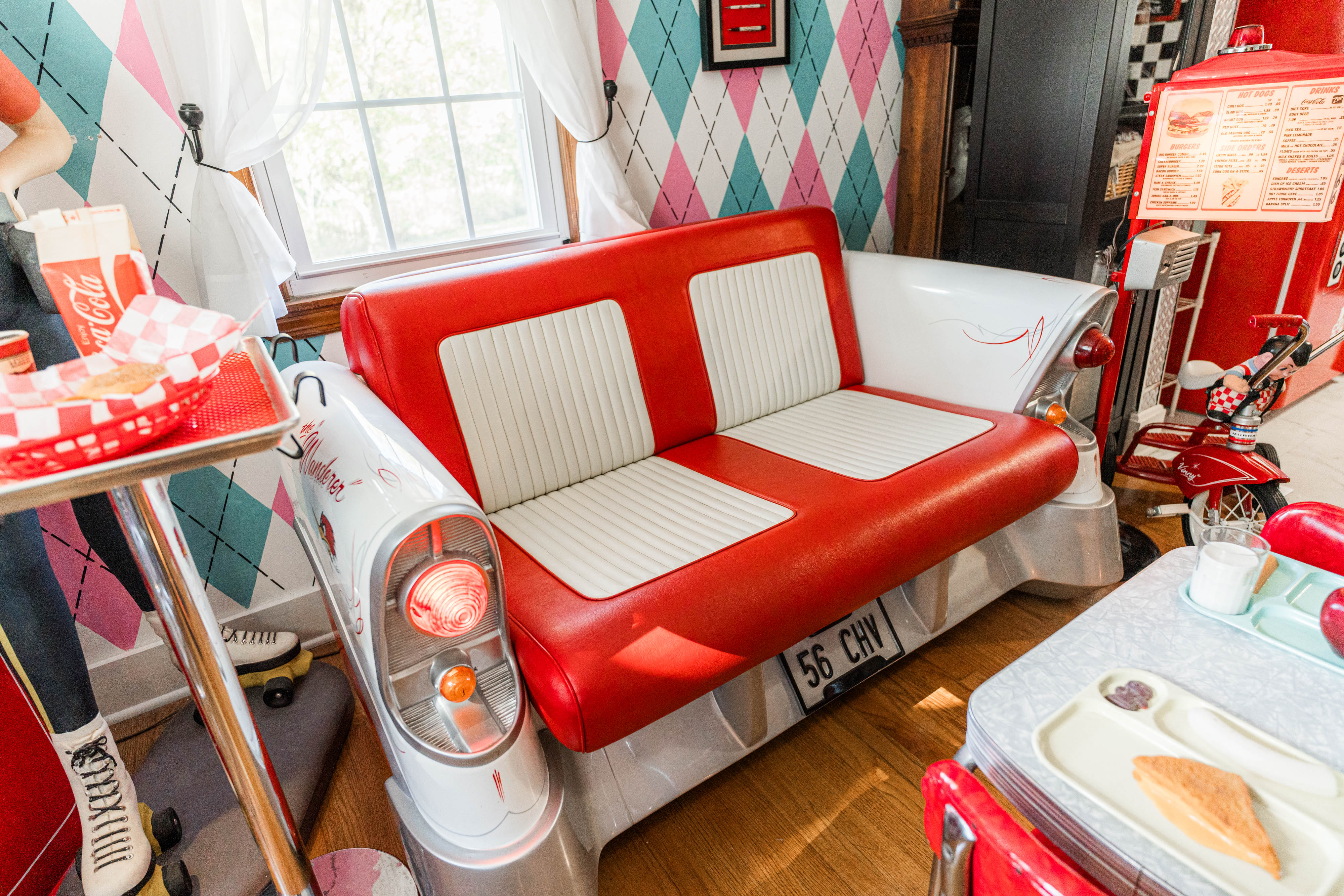 The 50s-inspired decor continues out to the garage, whose door Laura Galto painted with another diner scene.