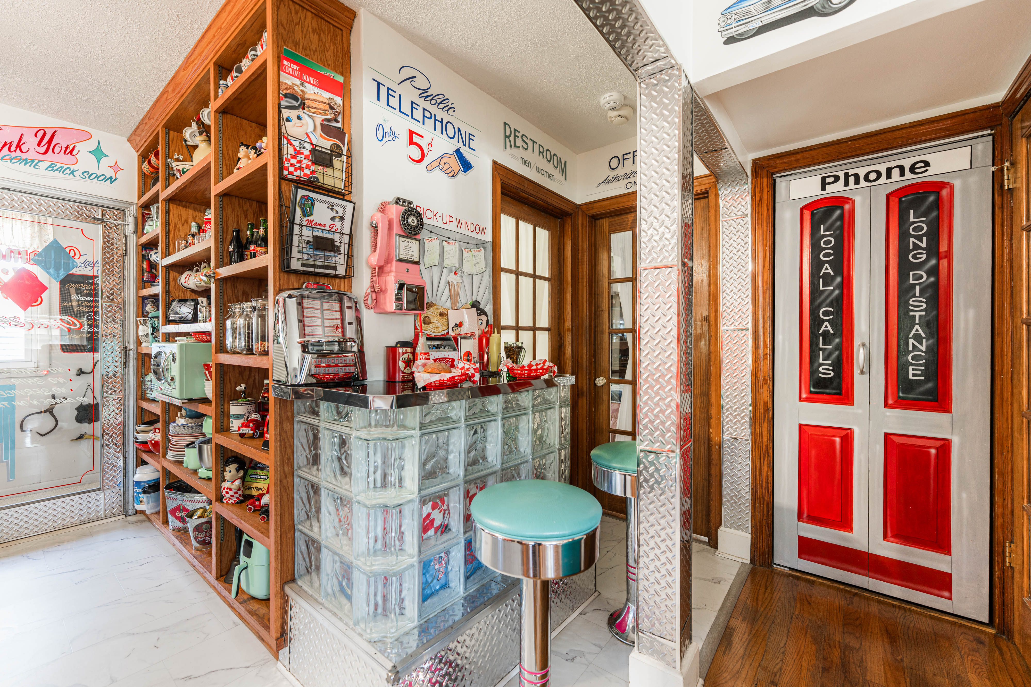The photo below shows the glass block diner counter the couple built and a door, seen to the right in the photo, that they painted to look like the phone booth a diner would have had back then.