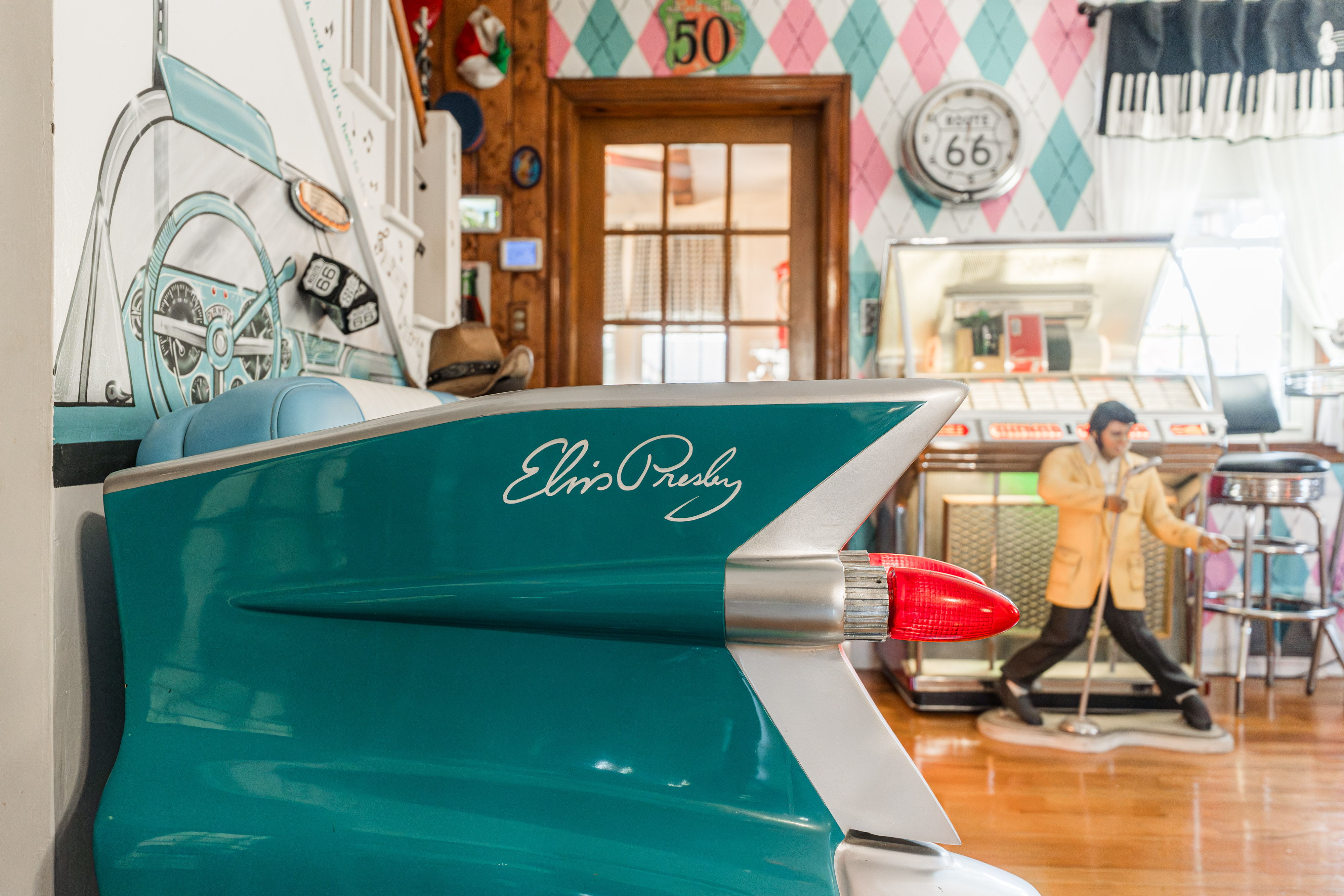 They bought the tailfin couches — the red one is a 1956 Chevy and the green one is a 1959 Cadillac — but Jim Galto took them to a new level when he wired their tail lights with working bulbs. On the Cadillac, seen below, they reproduced Elvis's autograph.